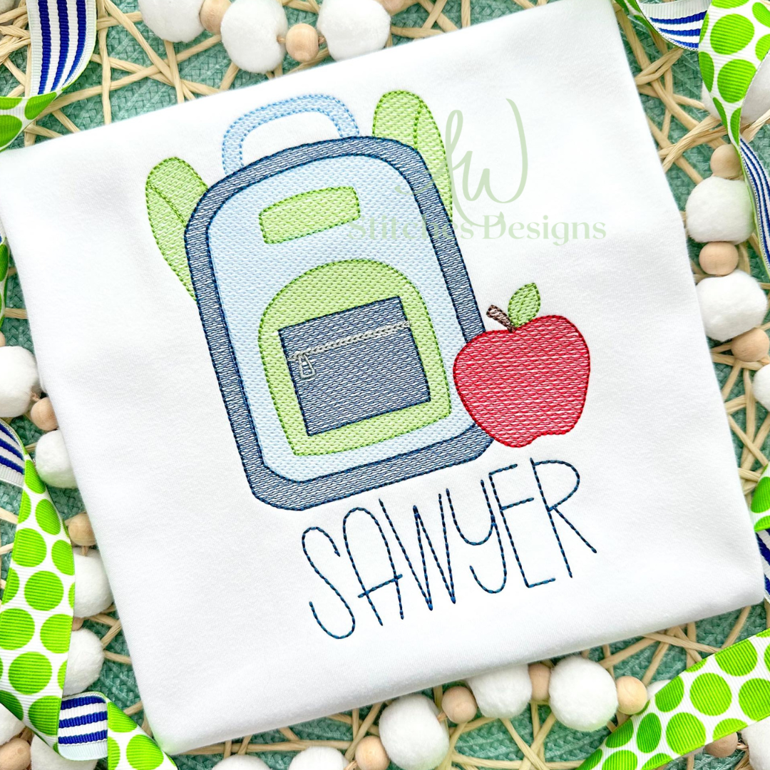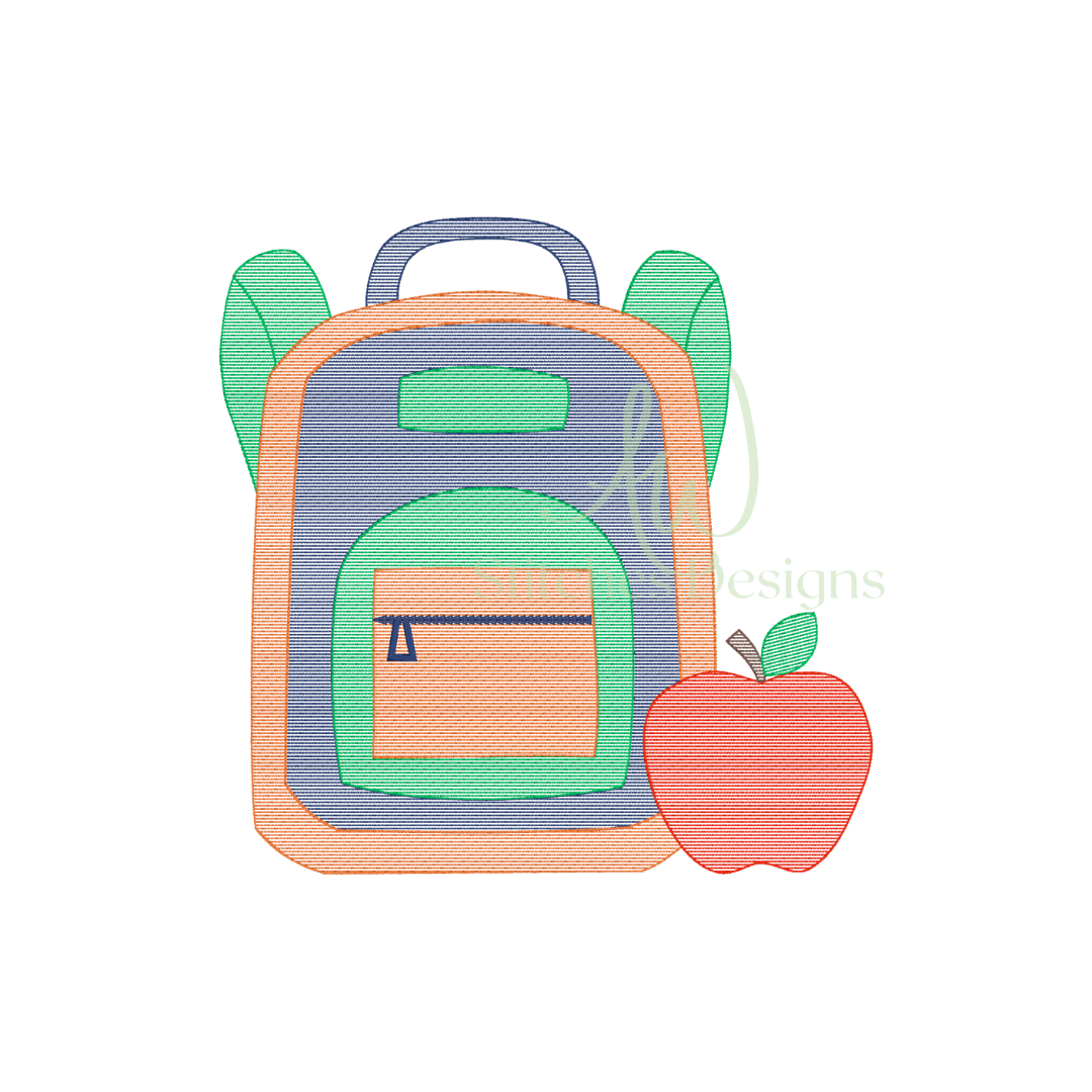 Backpack apple back to school first day of school sketch stitch machine embroidery design file is included in this download.