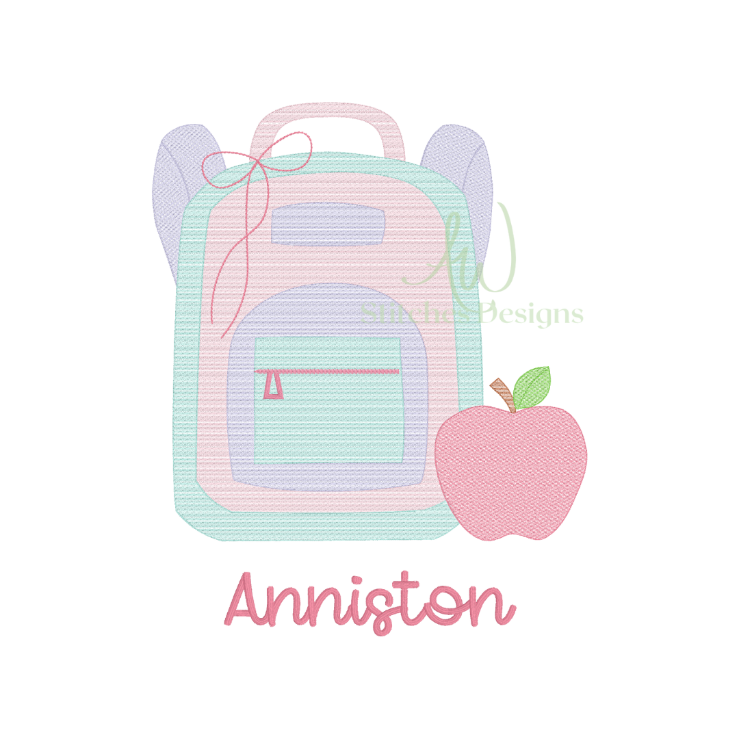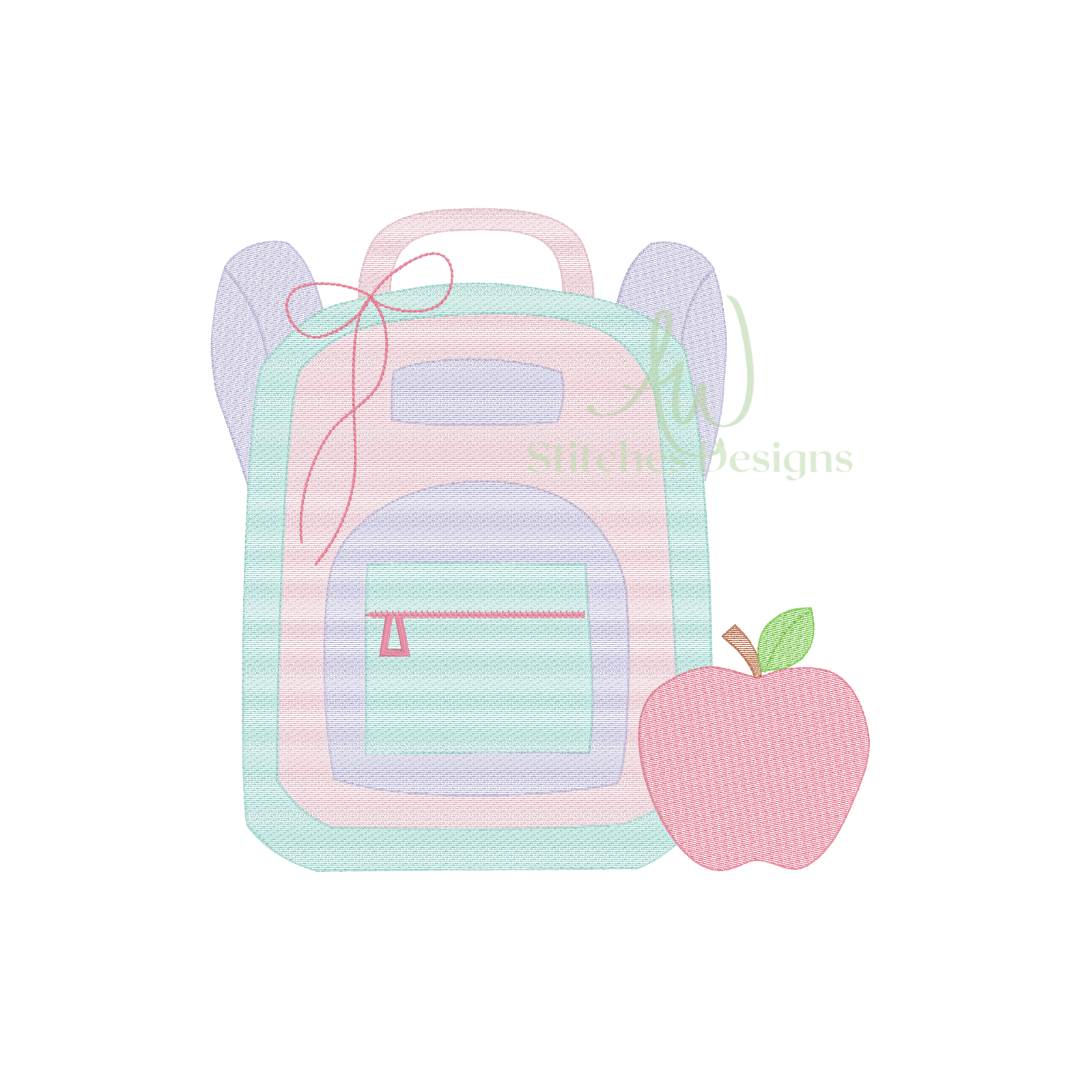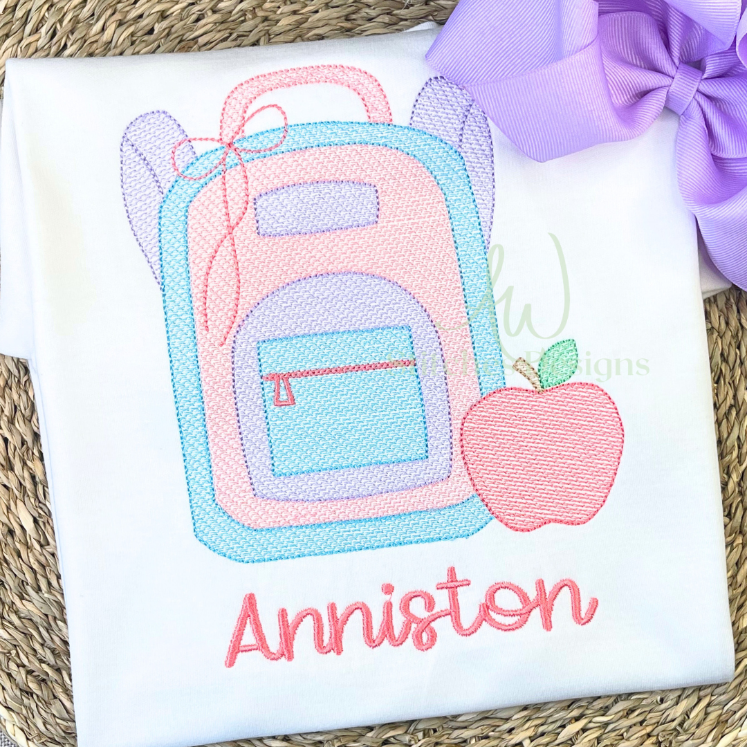 Backpack with bow apple back to school first day of school sketch stitch machine embroidery design file is included in this download.