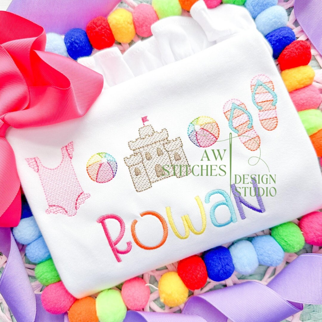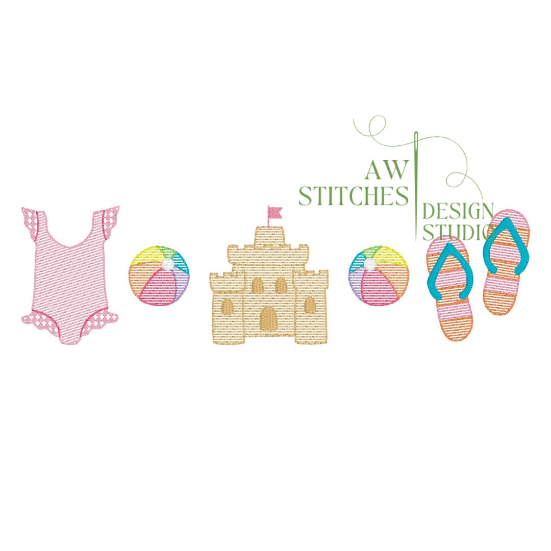 Beach summer sand castle sandcastle beachball bathing suit flip flops girl trio bean stitch vintage stitch machine embroidery design file is included in this download.