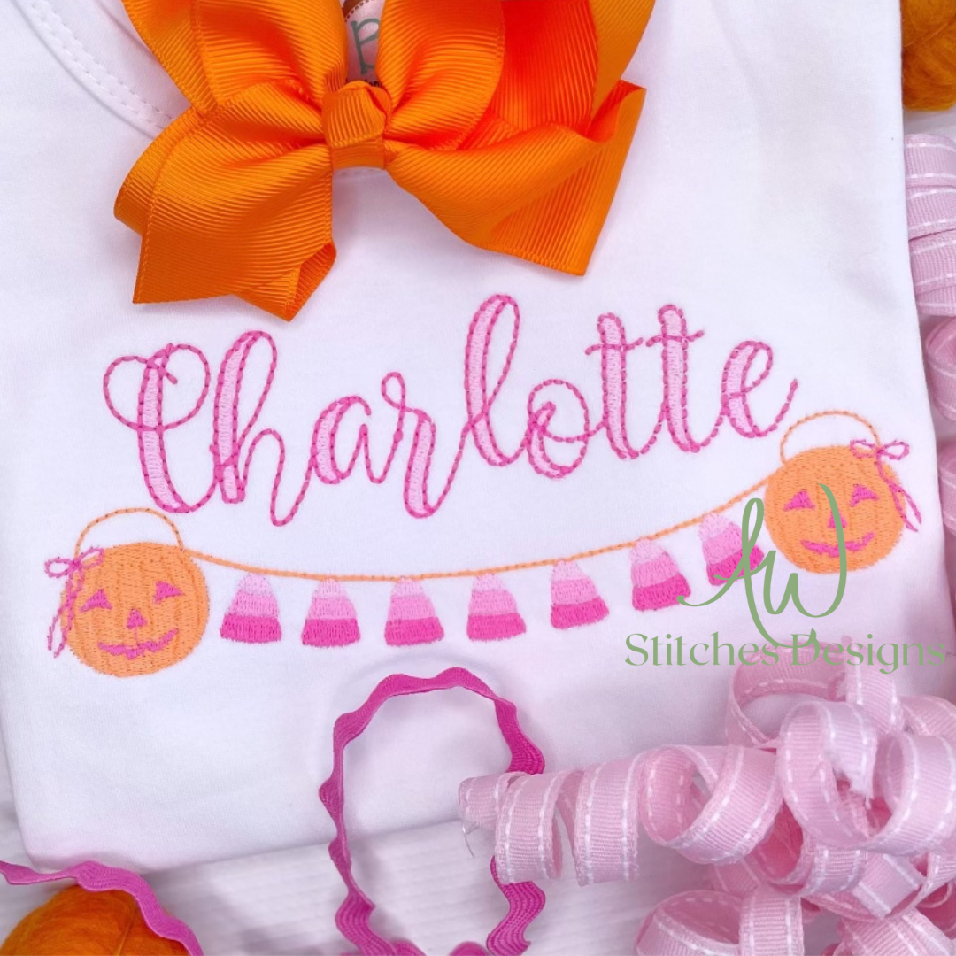 Halloween Jack-o'-Lantern Pumpkin with Bow Candy Corn Spooky Fall Bunting Banner Satin Stitch Embroidery Design File is included in this download.