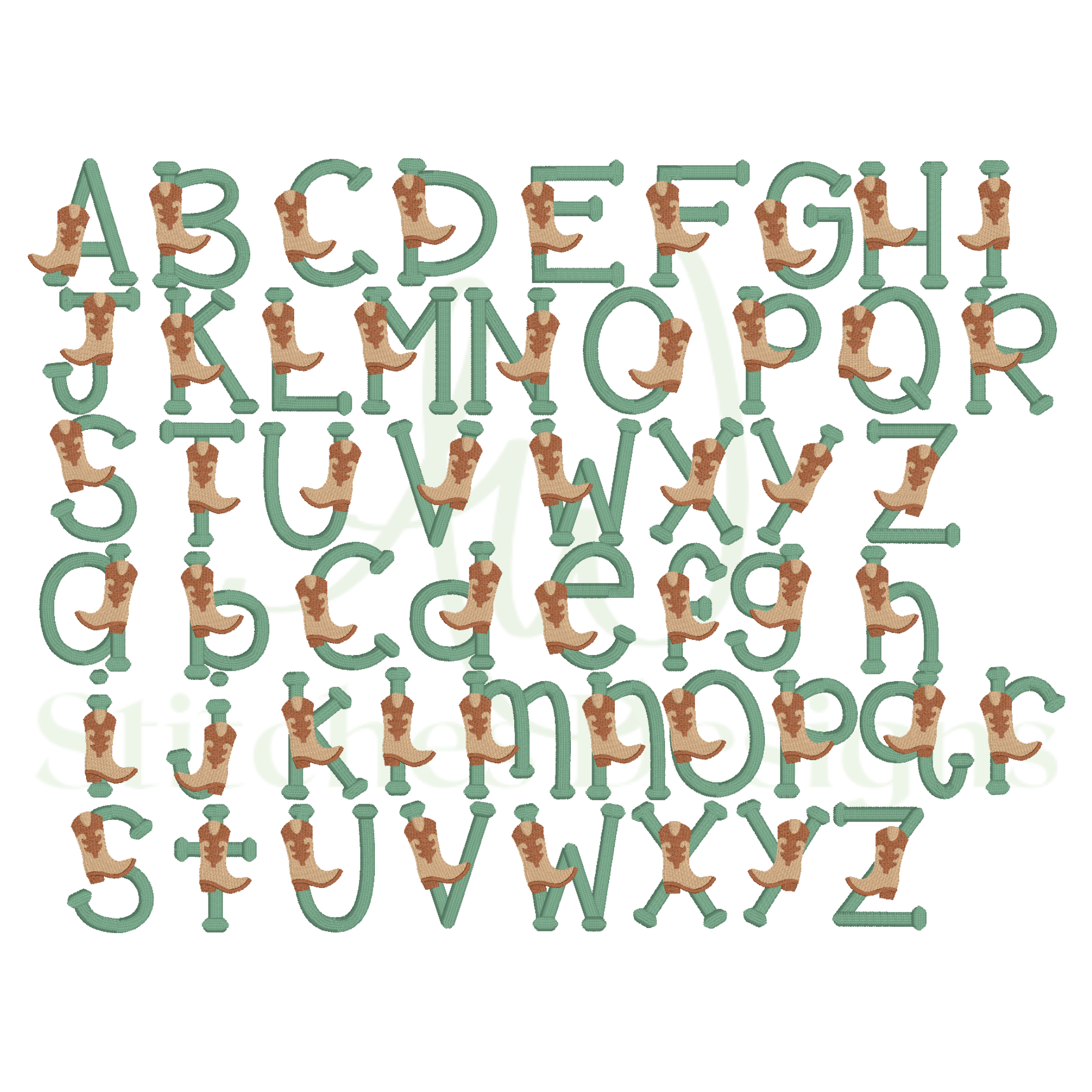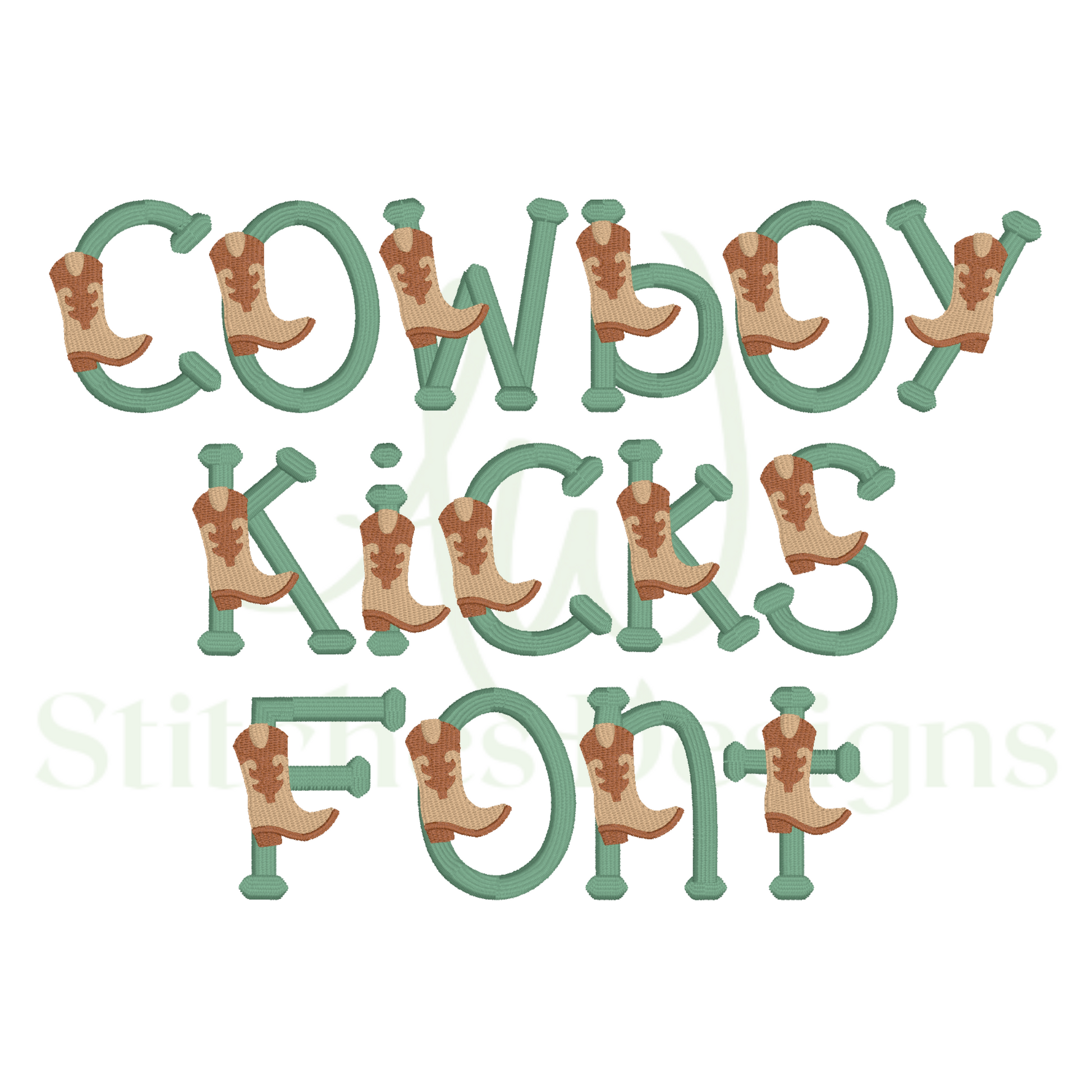 Cowboy Kicks satin stitch font for machine embroidery design file 1"- 2.5" upper and lowercase letters with BX is included with this download.