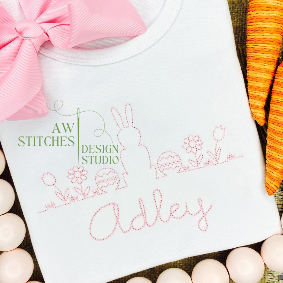 Easter bunny rabbit with Easter eggs and flowers bean stitch, quick stitch machine embroidery design file is included in this download.