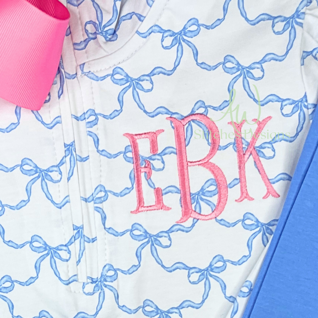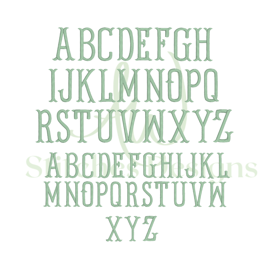 Fishtail monogram satin stitch font for machine embroidery design file 1.5"- 3.5" with BX is included in your download.