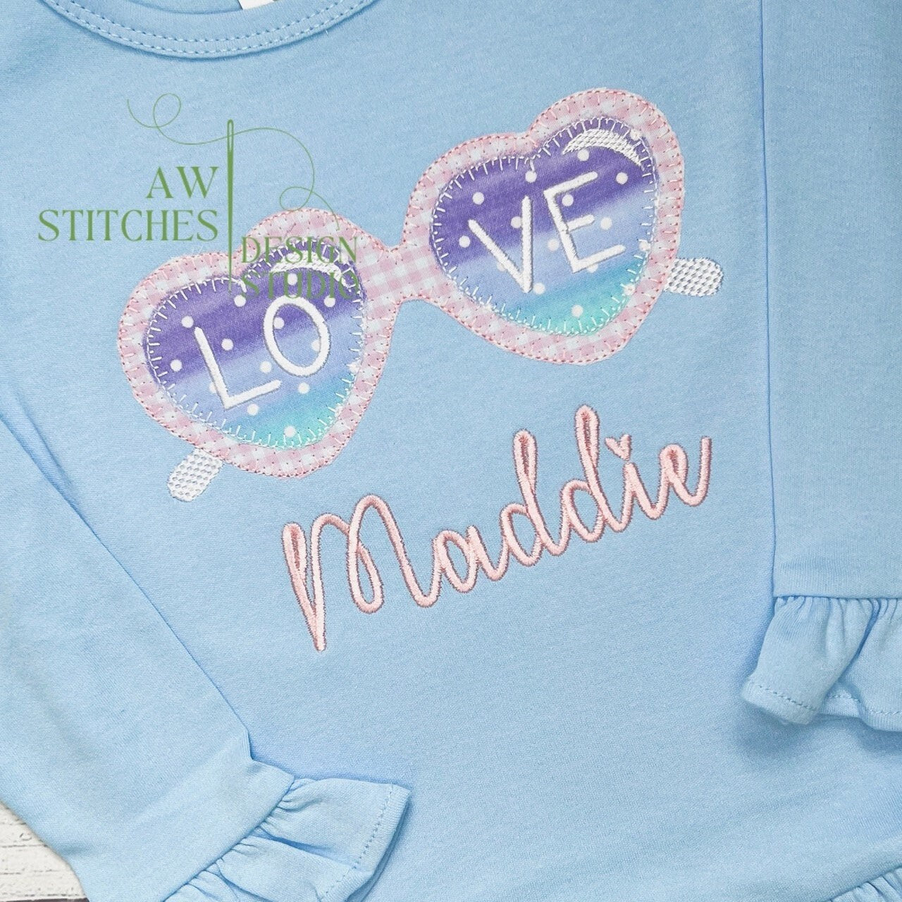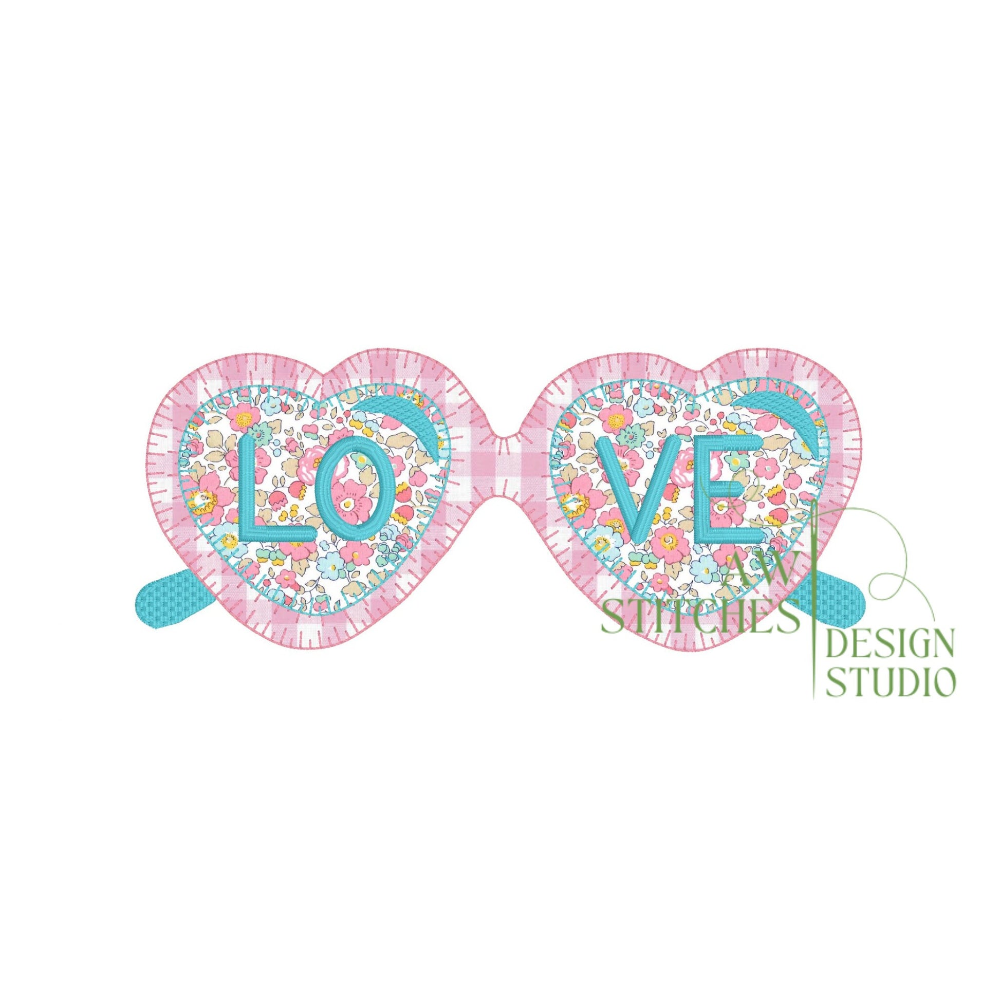 This file includes a heart sunglasses with LOVE letters applique embroidery design. This design comes in three different sizes: