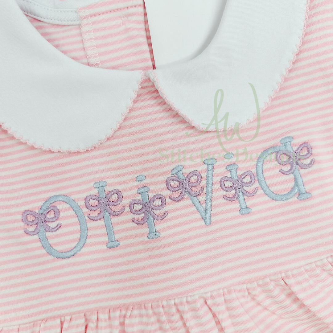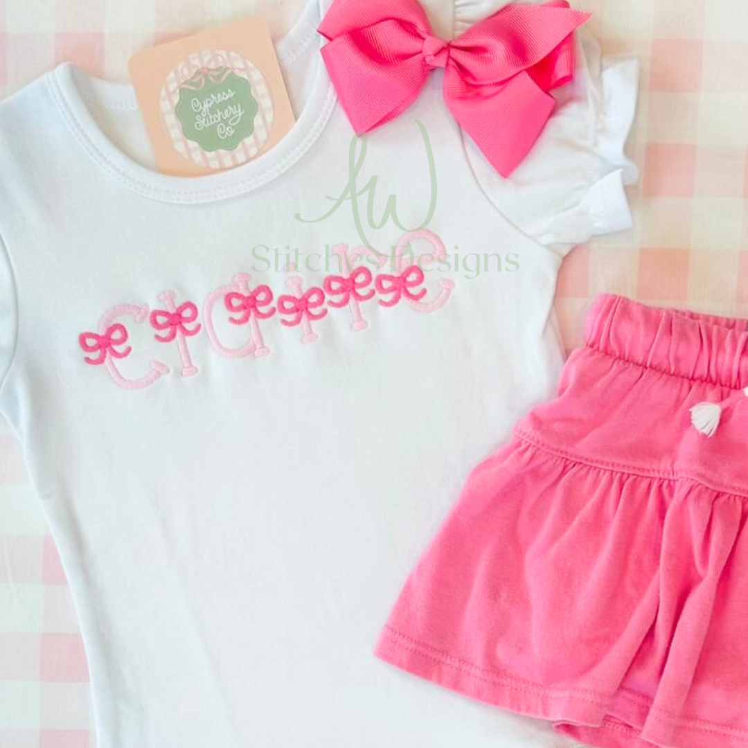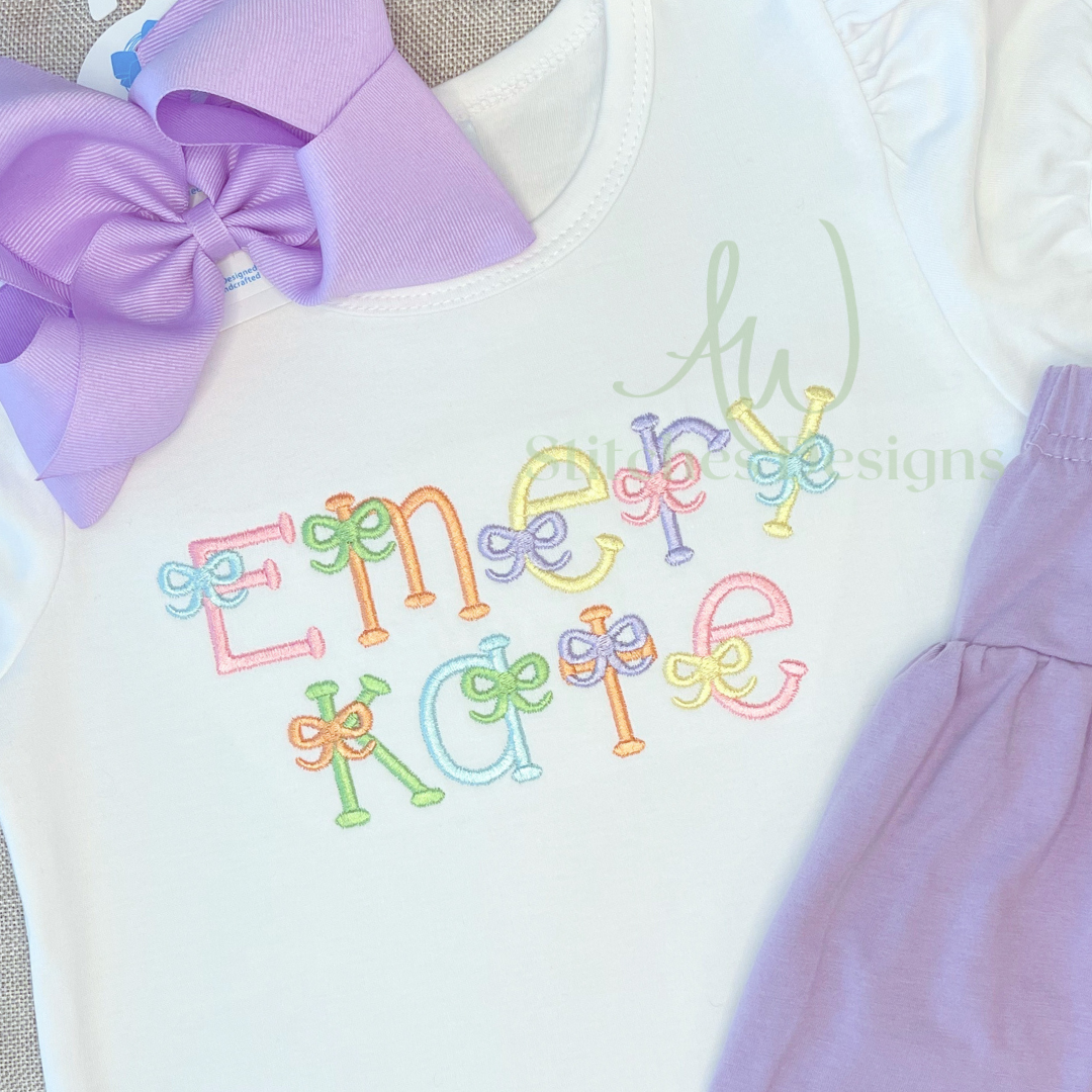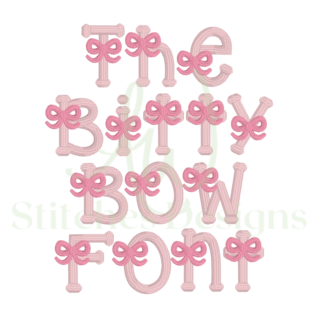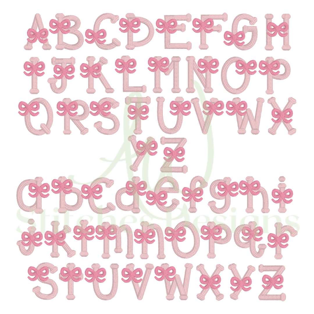 The bitty bow satin stitch font for machine embroidery design file 1"- 2.5" upper and lowercase letters with BX.