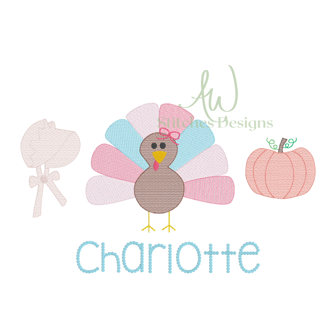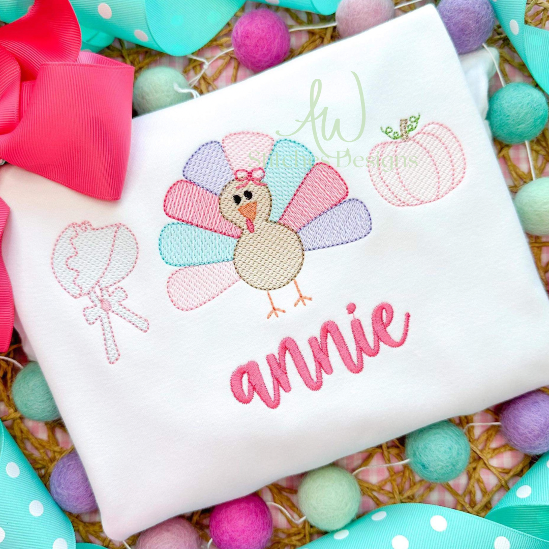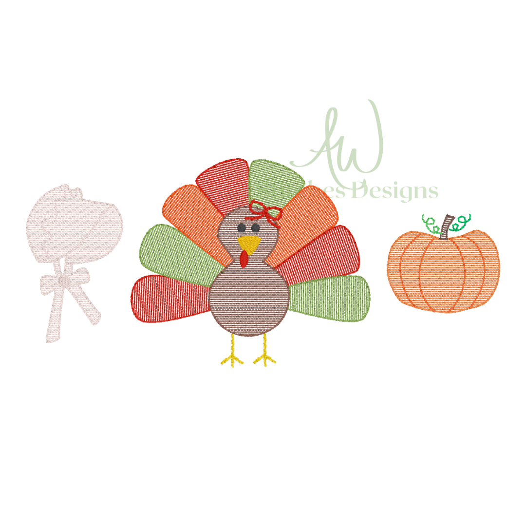 Turkey Trio Embroidery Thanksgiving Trio Embroidery with bow light fill stitch sketch stitch quick stitch machine embroidery design file is included in this download.